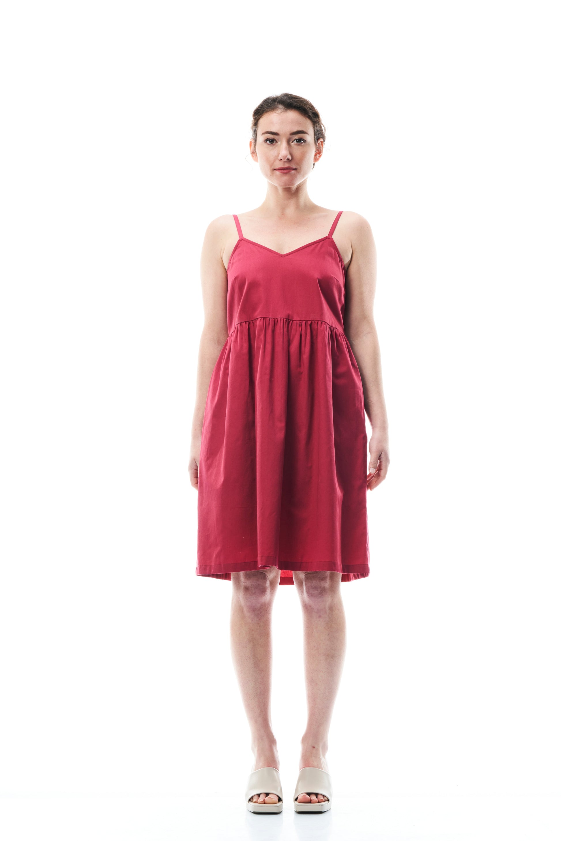 Abito in cotone con spalline sottili color ribes, chiusura laterale con cerniera.