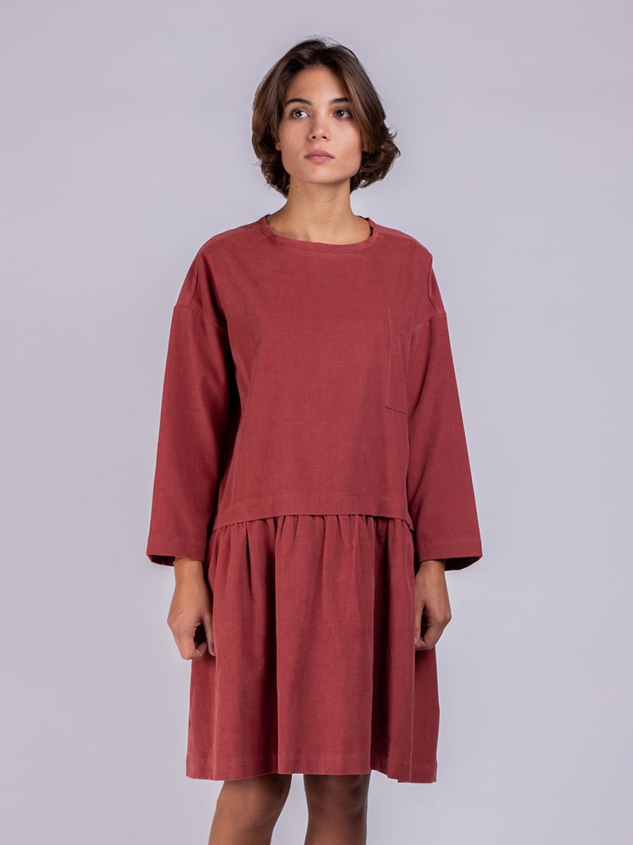 Ampio abito in velluto rosa scuro. Morbido e comodo, ha una tasca sul davanti e si allaccia dietro la nuca con un fiocco.