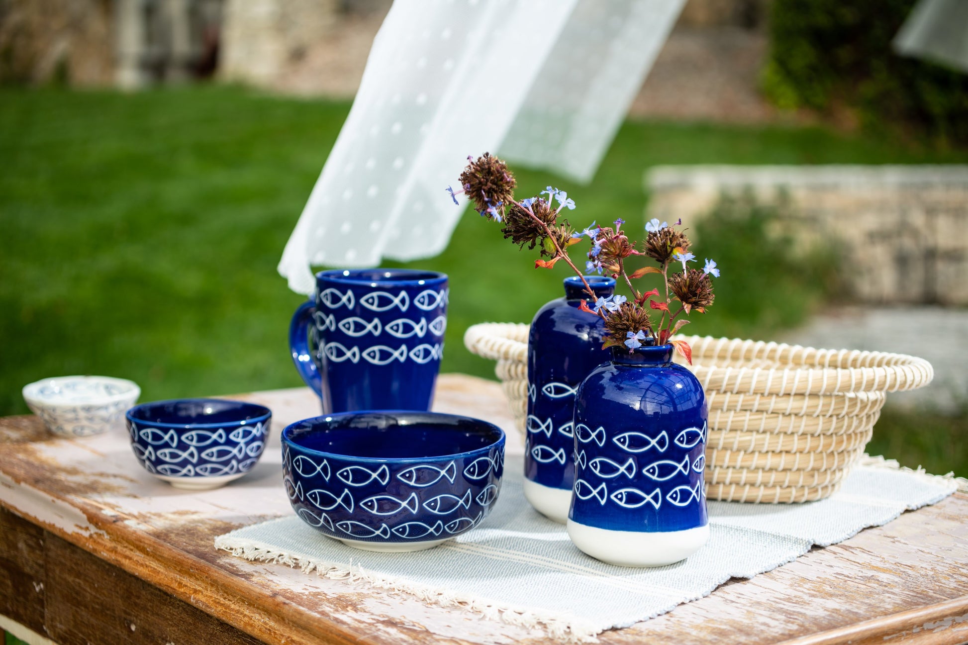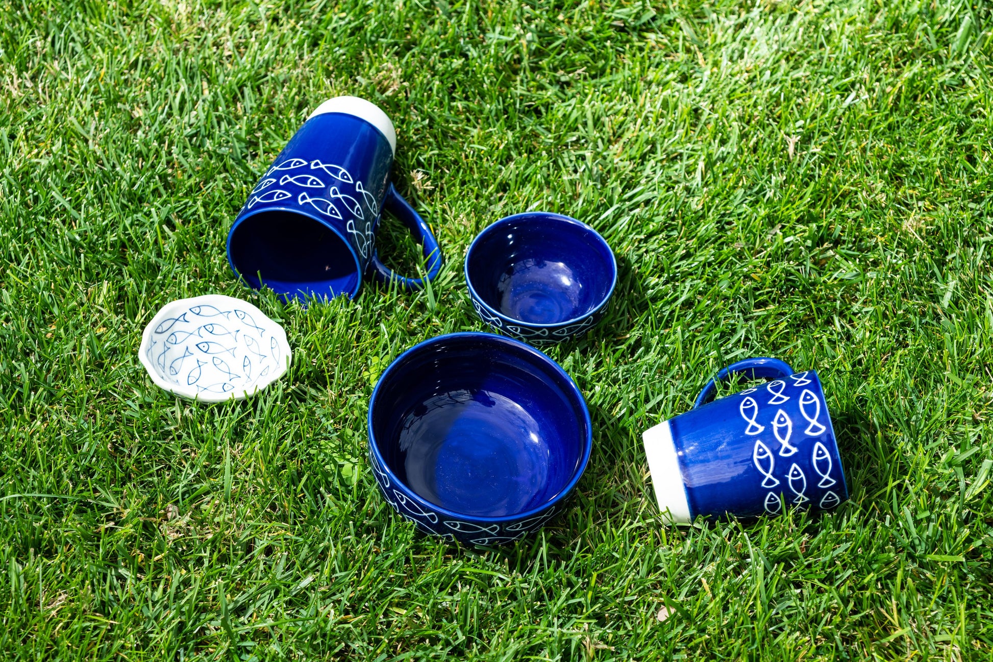Una ciotolina per salse, frutta secca, biscotti per una merenda allegra e colorata. I pesciolini che caratterizzano il pattern sono incisi nello smalto: pertanto, la base bianca rimane porosa, in contrasto con lo smalto lucido blu, creando un ricco e gradevole effetto tattile e visivo. Adatta a lavastoviglie e microonde.
