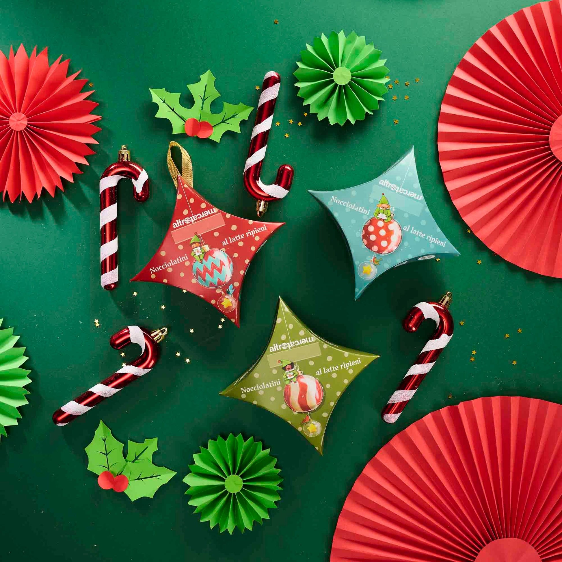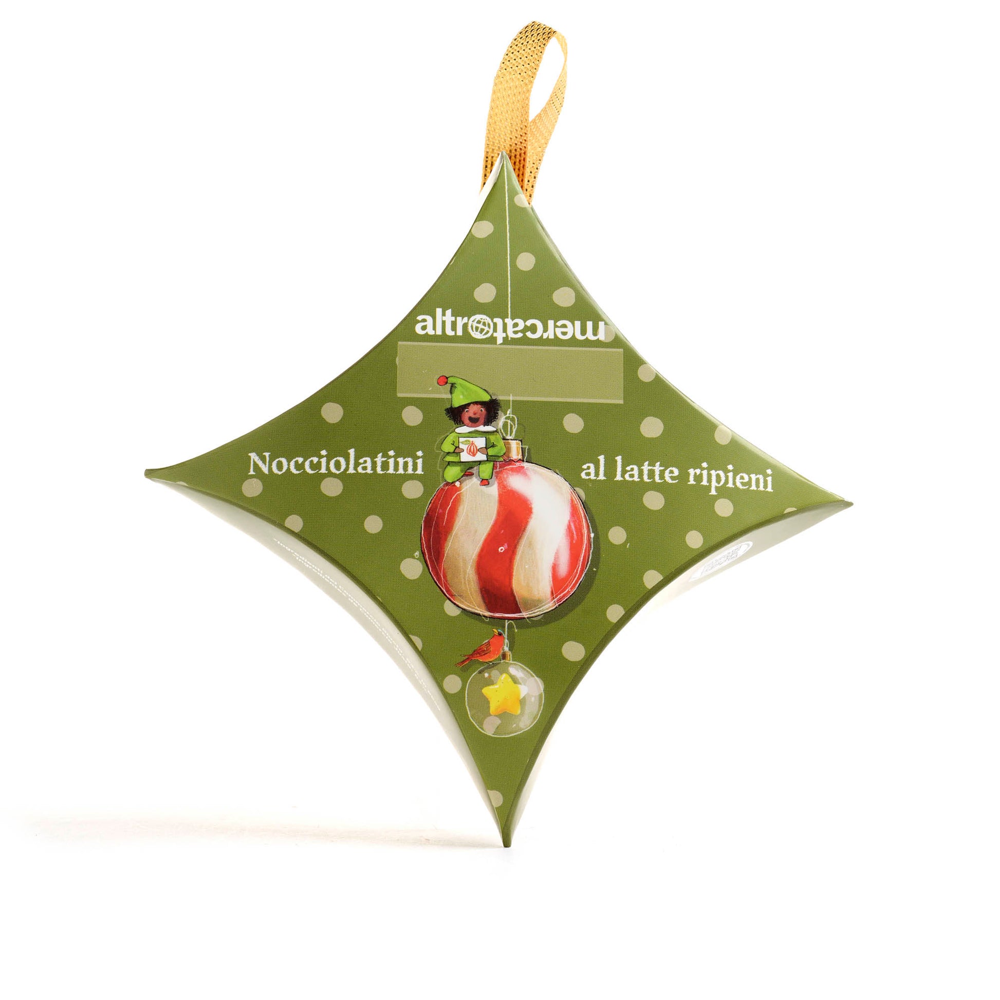 Cioccolatini Altromercato con cuore di crema alla nocciola e croccanti crispies, ricoperti con cioccolato al latte. L’astuccio appendibile, in cartoncino contiene 5 cioccolatini incartati singolarmente, realizzati con cacao da filiera equa e diretta e zucchero di canna. Prodotti con nocciole 100% italiane. Non è possibile selezionare i soggetti.