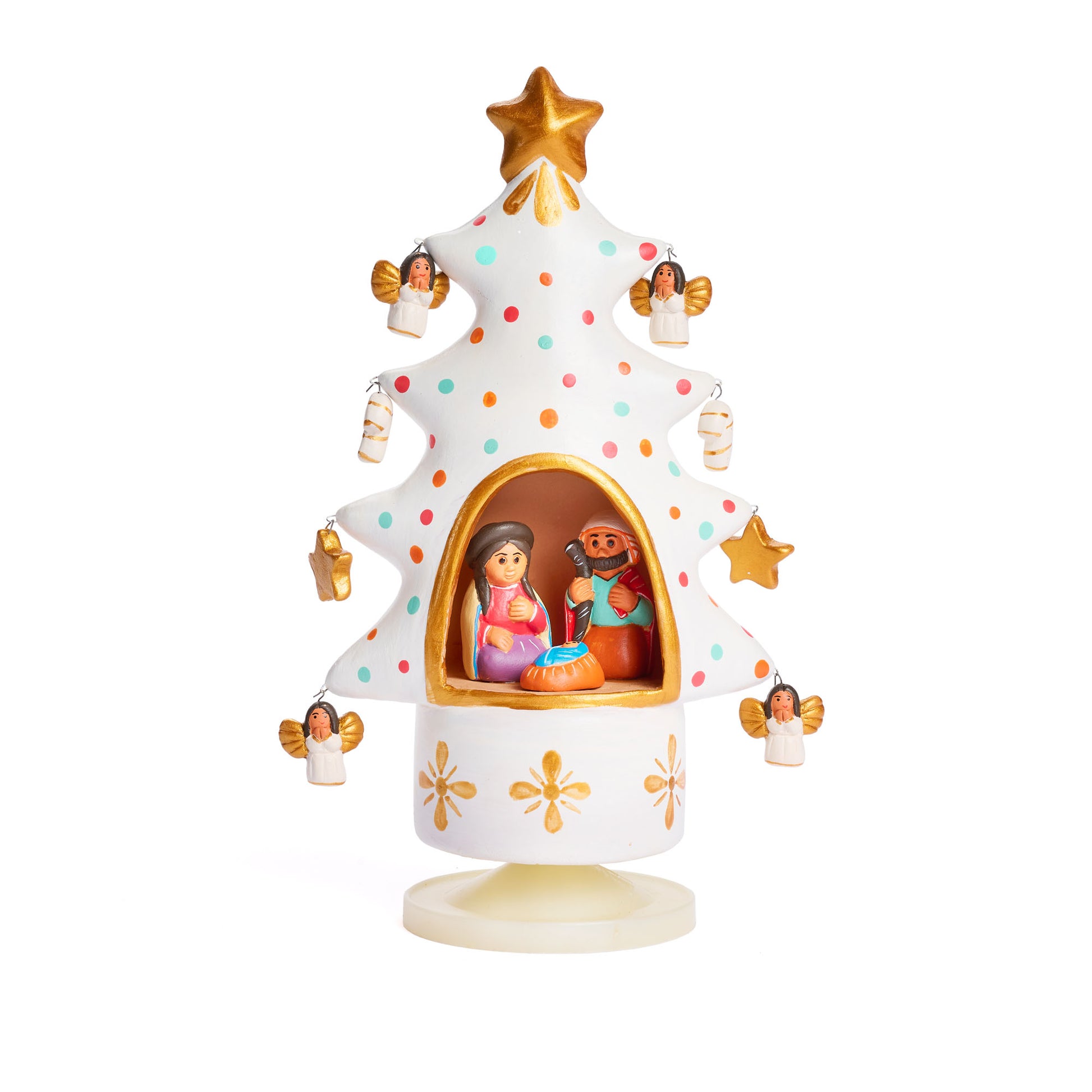 Presepe in ceramica, un carillon a forma di albero di Natale con all'interno un presepino