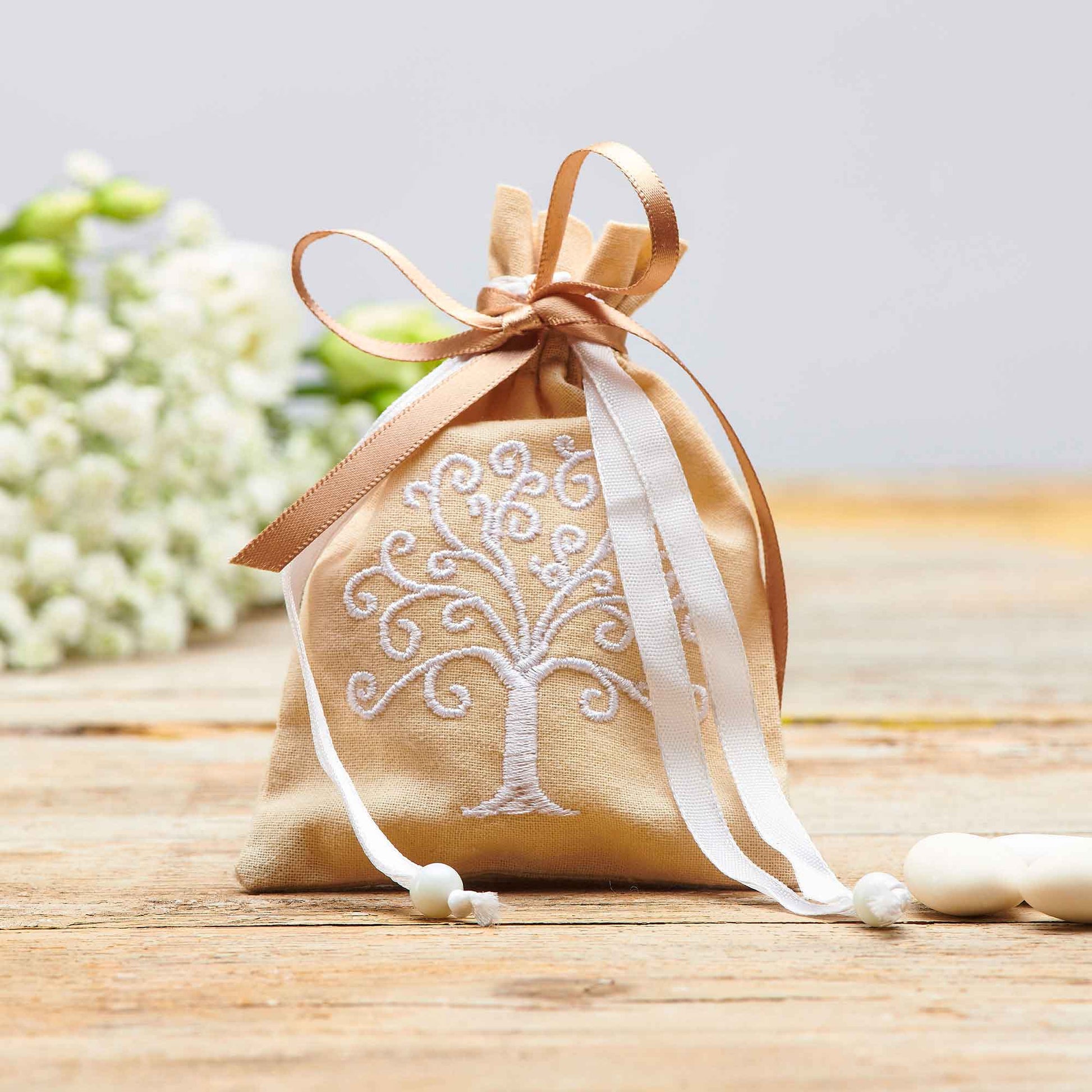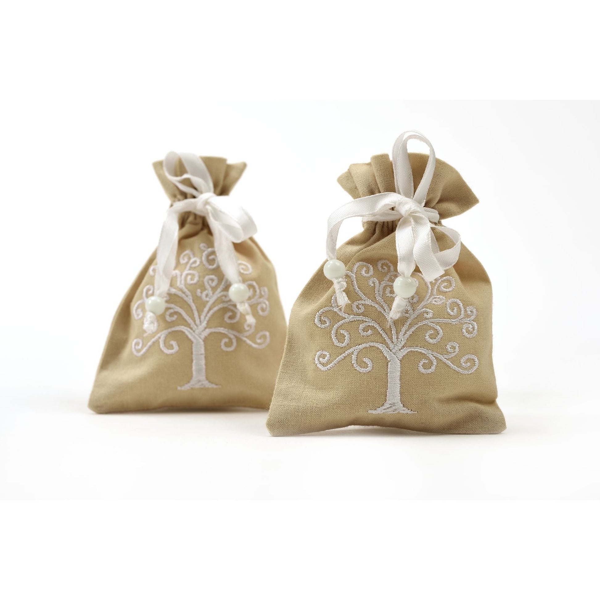 Un elegante porta confetti col simbolo dell’Albero della Vita ricamato, archetipo tra i più antichi e comune a varie culture. Neutro e riutilizzabile come profumatore per cassetti, se riempito di lavanda o pot-pourri, questo grazioso sacchetto dal bel significato è perfetto per celebrare con poesia il vostro giorno speciale. Contiene 5 confetti comodamente, eventualmente anche di più se usato come sacchetto da riempire nella confettata del ricevimento