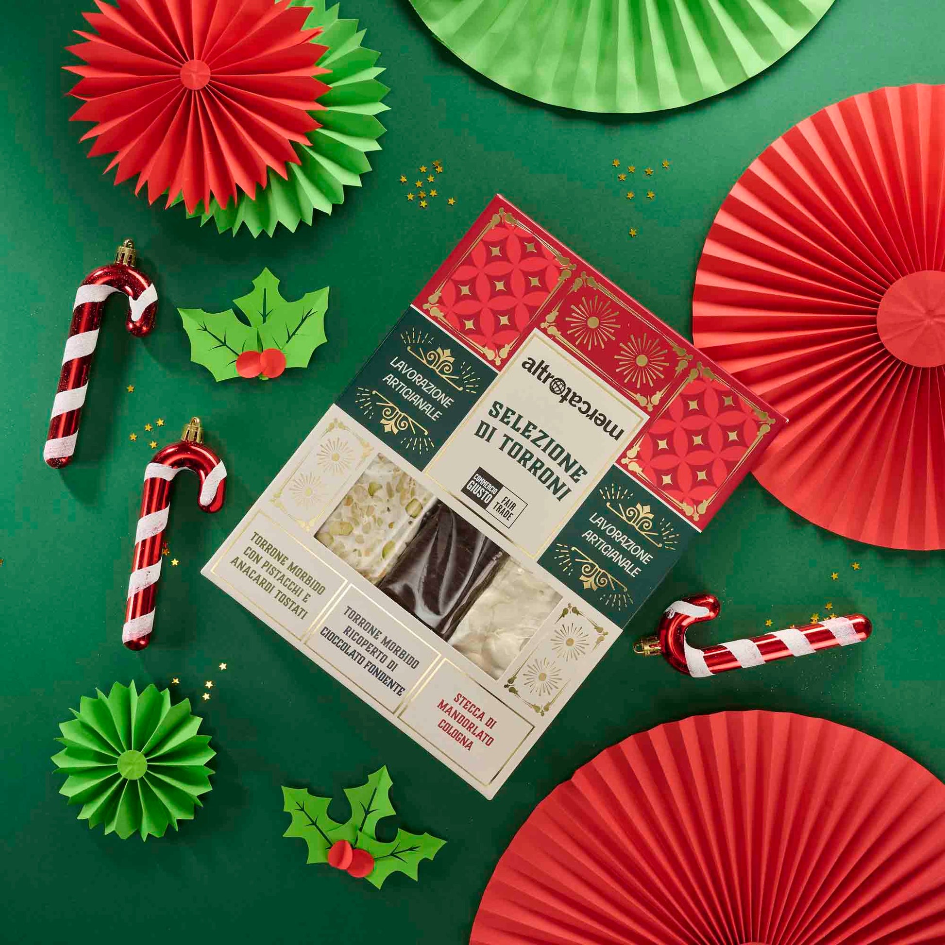 Selezione di torroni artigianali Altromrcato: morbido al pistacchio, morbido agli anacardi ricoperto con cioccolato fondente, e mandorlato Cologna