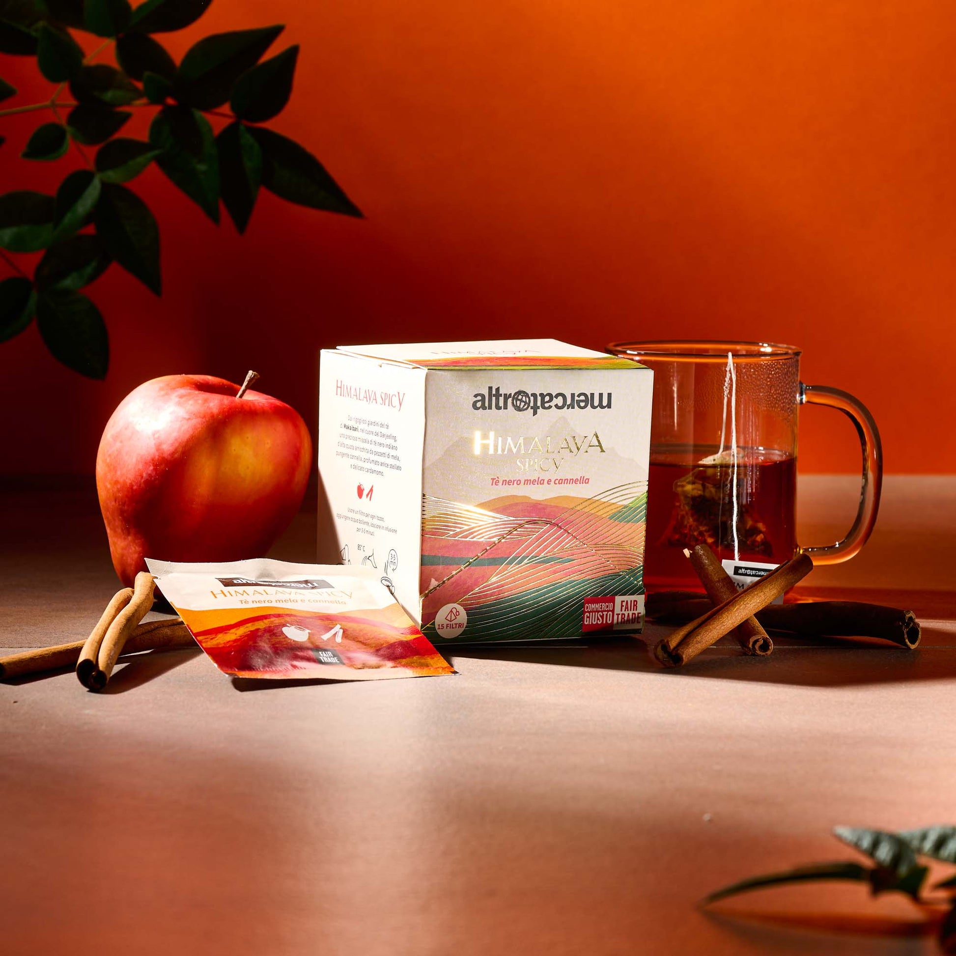 Dai rigogliosi giardini del tè di Makaibari, nel cuore del Darjeeling arriva questa preziosa miscela Altromercato di tè nero indiano d'alta quota arricchita da pezzetti di mela, pungente cannella, profumato anice stellato e delicato cardamomo.