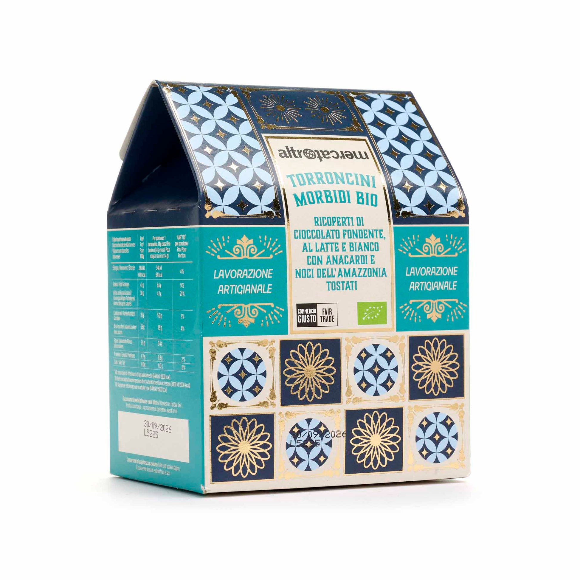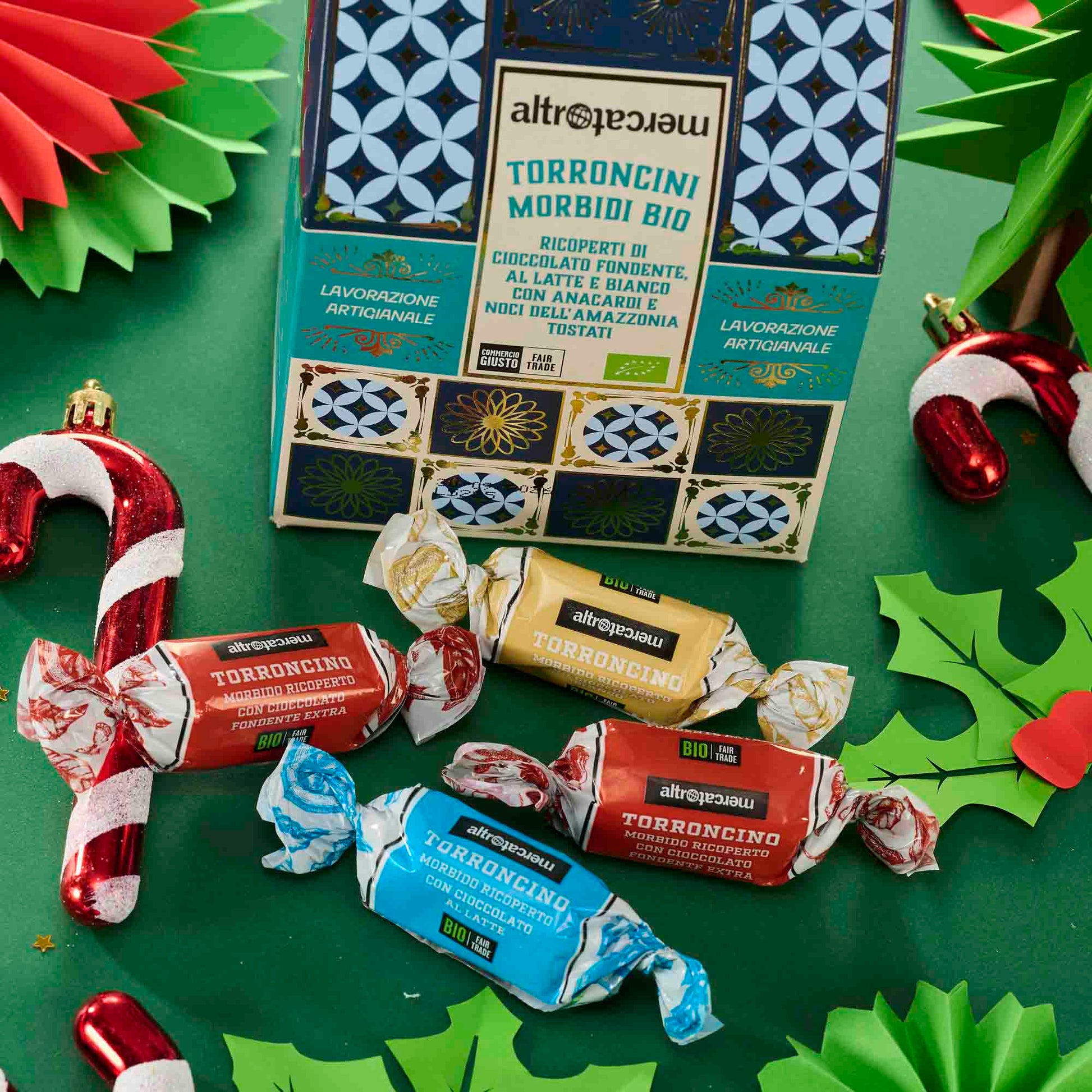 I torroncini Altromercato sono il frutto di ingredienti equosolidali sapientemente lavorati da artigiani torronieri secondo tradizione. La copertura ai tre cioccolati avvolge un morbido ripieno di miele da fioritura spontanea, zucchero di canna e deliziose noci dell’Amazzonia, regalandoti un morso buono per te e per tutti.