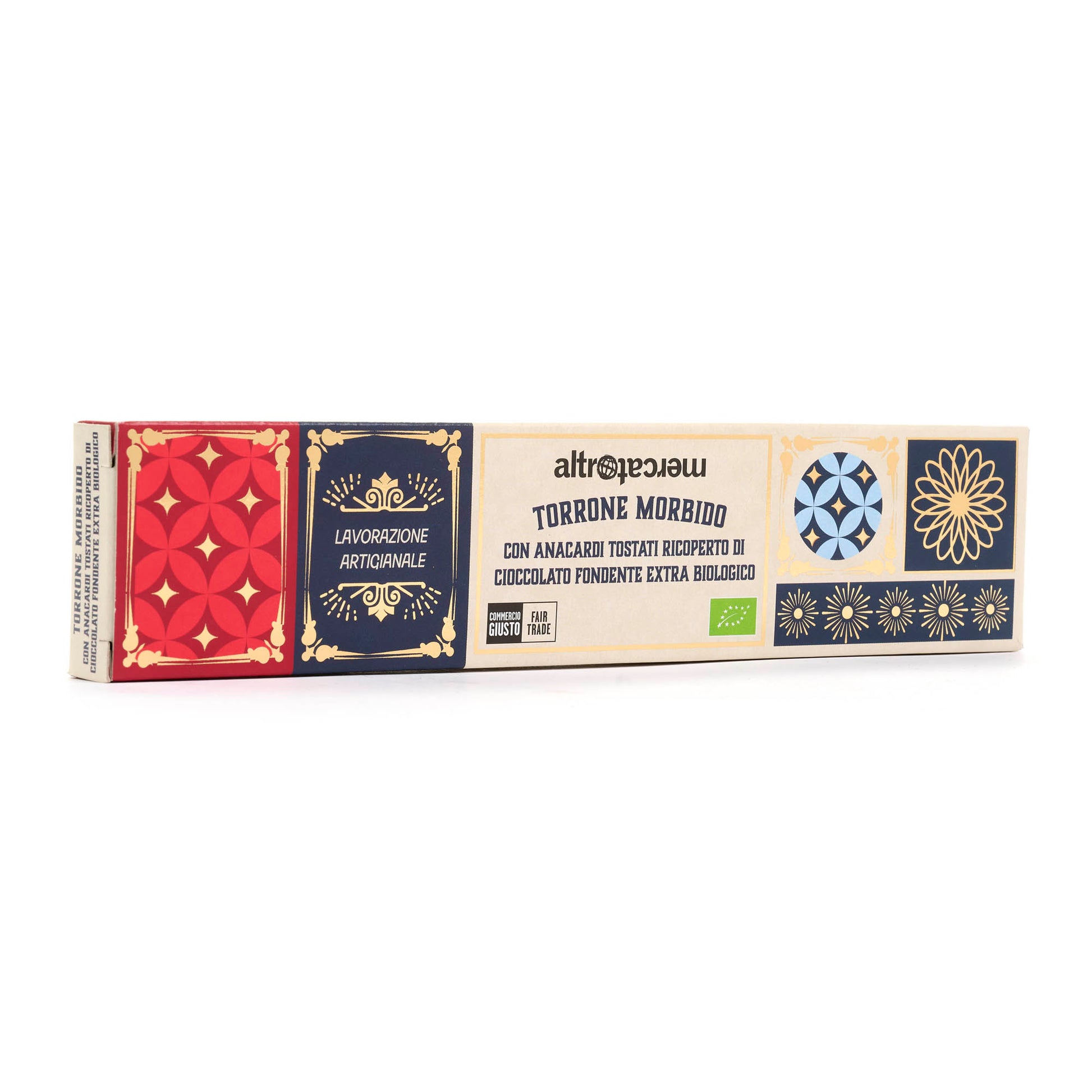 Torrone morbido, ricoperto di cioccolato fondente con miele e anacardi dalle nostre filiere equosolidali, realizzato a mano secondo la tradizione torroniera italiana.