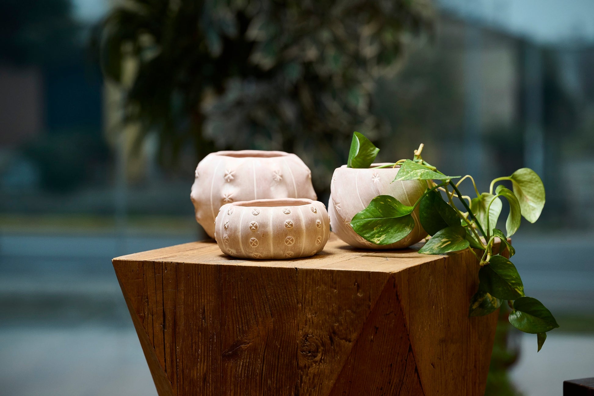 Un simpatico oggetto artigianale realizzato con finitura bianca sfumata, ornato da un motivo inciso o a rilievo che lo rende particolare e decorativo. Perfetto per contenere una pianta grassa, è anche un vero e proprio elemento di arredo che renderà unico il vostro angolo verde. Avvertenza: se irrigati in ambiente interno, aver cura di mettere un sottovaso per evitare l’eventuale trasudamento di umidità su mobili o pavimenti.